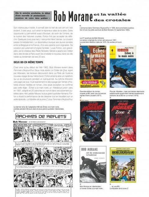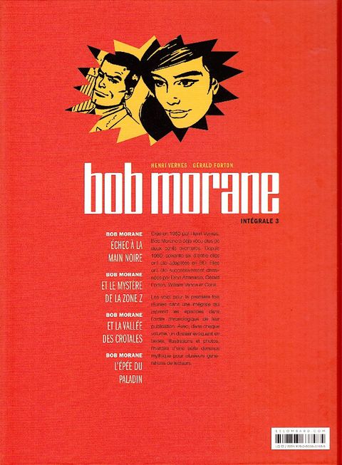 Polytechnicien, polyglotte, ex-commandant d'aviation, bourlingueur au grand coeur, séducteur, Bob Morane traque le mal sous toutes ses formes et sous toutes les latitudes. Et il peut toujours compter sur l'aide de son plus fidèle ami, le colosse écossais Bill Balantine... Comprend 4 tomes de la série d'origine, enfin réédités, scénarisés par Vernes et dessinés par Forton : - Echec à la Main Noire, - Le Mystère de la zone Z, - La Vallée des Crotales - et L'Epée du Paladin