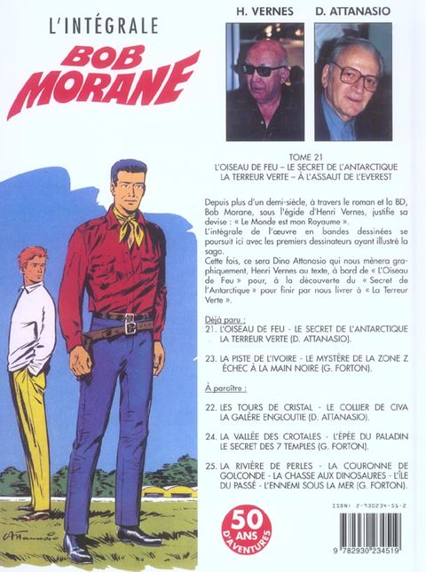 Depuis plus d'un demi-siècle, à travers le roman et la BD, Bob Morane, sous l'égide d'Henri Vernes, justifie sa devise : " Le Monde est mon Royaume ". L'intégrale de l'oeuvre en bandes dessinées se poursuit ici avec les premiers dessinateurs ayant illustré la saga. Cette fois, ce sera Dino Attanasio qui nous mènera graphiquement, Henri Vernes au texte, à bord de " L'Oiseau de Feu " pour, à la découverte du " Secret de l'Antarctique " pour finir par nous livrer à " La Terreur Verte ".