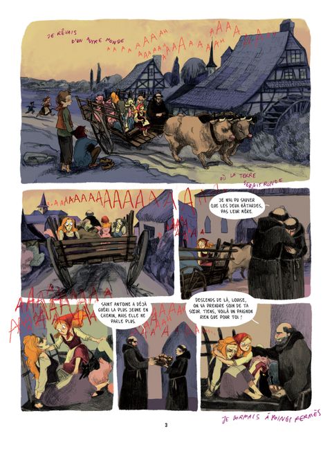 Lorsque cette histoire commence, le décor est apparemment celui du Moyen Age. Mais la bande-son, elle, suggère autre chose: rien moins qu’un vieux tube du groupe Téléphone, Un Autre monde… Tissée de deux lignes temporelles distinctes (l’une dans un environnement médiéval non daté, l’autre au coeur de notre époque contemporaine) qui vont finir par s’entremêler en une même trame, cette très intrigante histoire suit pas à pas le quotidien d’une jeune fille des années 80, Lou, dont le destin bascule soudainement à la suite d’une séance de spiritisme qui tourne mal. Traumatisée par le suicide de son amie Marie-Rose, qui n’a pas supporté ce que lui a révélé ce contact avec le monde des esprits, Lou mène l’enquête. Elle va peu à peu être confrontée, en lisière de l’apparente normalité qui constitue son quotidien, à des phénomènes de plus en plus déroutants. Hypnose, fantômes, visions, réminiscences vaudou… Pourquoi la réalité qui constituait jusqu’alors son ordinaire semble-t-elle insensiblement se déliter pour laisser apparaître un autre monde au parfum d’étrangeté, d’abord fugace puis de plus en plus marqué ? Ainsi intitulé en référence à un poème des Contemplations de Victor Hugo, le nouveau projet de la dessinatrice Maud Begon (Je n’ai jamais connu la guerre, publié chez KSTR) est une tétralogie créée en collaboration avec la romancière Carole Martinez, auteure notamment du Prix Goncourt des Lycéens 2011, Du domaine des Murmures. Un grand récit fantastique par un nouveau duo féminin plein de promesses.