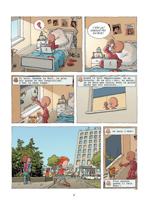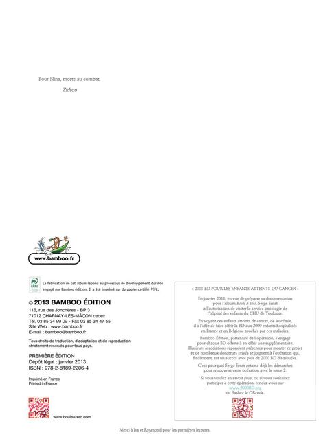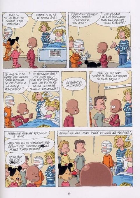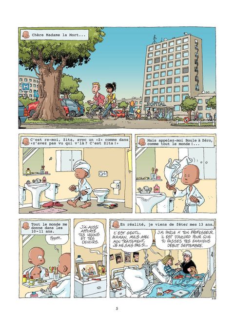 Les aventures pleines d'humour et de tendresse d'une petite fille hospitalisée. Bonjour, je m'appelle Zita, mais ici, à l'hôpital La Gaufre, tout le monde m'appelle « Boule à zéro ». Je souffre d'une leucémie. Ma seule consolation d'être à l'hosto, c'est Mama Kigali. Mama Kigali est conteuse professionnelle. Les histoires, elle les raconte comme personne ! Aujourd'hui, elle nous a conté une vieille légende africaine selon laquelle la personne malade qui arriverait à toucher la queue d'un crocodile serait guérie instantanément. Vous allez sans doute me dire que je ferais mieux de ne pas croire à cette histoire de crocodile à la queue miraculeuse. Pourquoi pas, après tout ? J'ai bien cru à tous ces traitements que les docteurs m'ont infligés pendant des années. Et regardez où j'en suis !