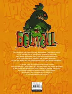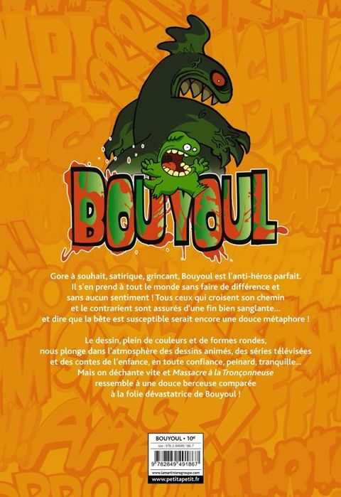 Gore à souhait, satirique, grinçant, Bouyoul est l'anti-héros parfait. Il s'en prend à tout le monde sans faire de différence et sans aucun sentiment ! Tous ceux qui croisent son chemin et le contrarient sont assurés d'une fin bien sanglante... et dire que la bête est susceptible serait encore une douce métaphore ! Le dessin, plein de couleurs et de formes rondes, nous plonge dans l'atmosphère des dessins animés, des séries télévisées et des contes de l'enfance, en toute confiance, peinard, tranquille... Mais on déchante vite et massacre à la tronçonneuse ressemble à une douce berceuse comparée à la folie dévastatrice de Bouyoul !