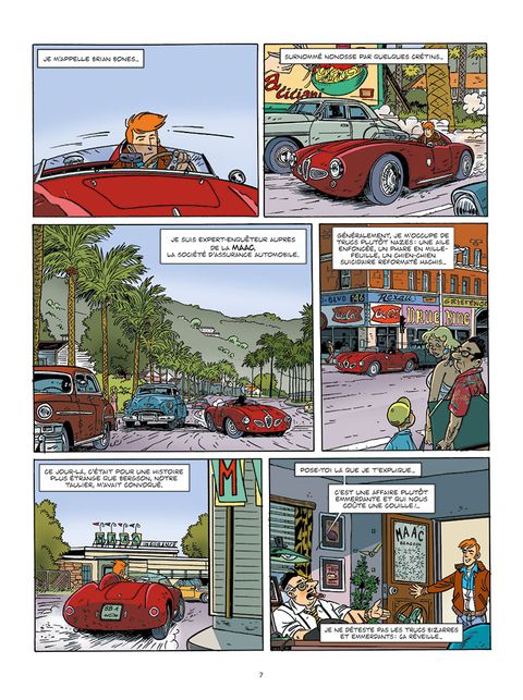 Buick "Roadmaster", Cadillac "Eldorado", Corvette "57", trois voitures mythiques qui parcourent les routes américaines. Mais aussi trois véhicules à l'origine d'investigations que l'on va confier à Brian Bones, enquêteur pour les assurances MAAC. Un accident étrange, une mort suspecte, des OVNI dans le désert... autant d'escroqueries potentielles ? C'est le travail de Brian Bones que de faire la lumière sur ces affaires. Et ce ne sont pas quelques accortes jeunes femmes qui vont l'empêcher de terminer ses enquêtes.