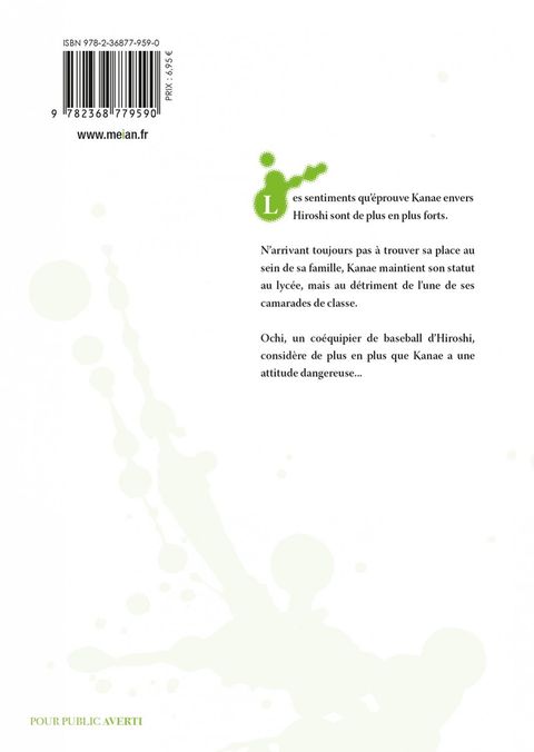 Les sentiments qu'éprouve Kanae envers Hiroshi sont de plus en plus forts. N'arrivant toujours pas à trouver sa place au sein de sa famille, Kanae maintient son statut au lycée, mais au détriment de l'une de ses camarades de classe. Ochi, un coéquipier de baseball d'Hiroshi, considère de plus en plus que Kanae a une attitude dangereuse... Un amour déliquescent, corrompu par la quête du bonheur... Qui sait ce qui les attend au bout du virage ? Le paradis... ou bien l'enfer ?
