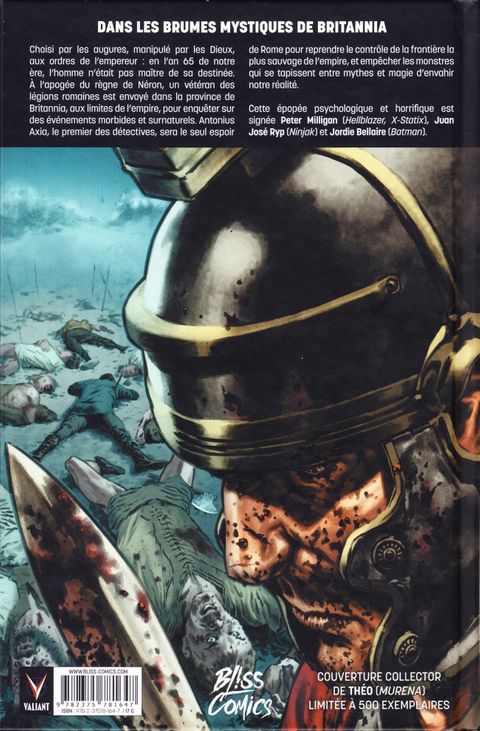 Choisi par les augures, manipulé par les Dieux, aux ordres de l’empereur : en l’an 65 de notre ère, l’homme n’était pas maître de sa destinée. À l’apogée du règne de Néron, un vétéran des légions romaines est envoyé dans la province de Britannia, aux limites de l’empire, pour enquêter sur des événements morbides et surnaturels. Antonius Axia, le premier des détectives, sera le seul espoir de Rome pour reprendre le contrôle de la frontière la plus sauvage de l’empire, et empêcher les monstres qui se tapissent entre mythes et magie d’envahir notre réalité. Cette épopée psychologique et horrifique est signée Peter Milligan (Hellblazer, X-Statix), Juan José Ryp (Ninjak) et Jordie Bellaire (Batman). Contient la mini-série Britannia #1-4.