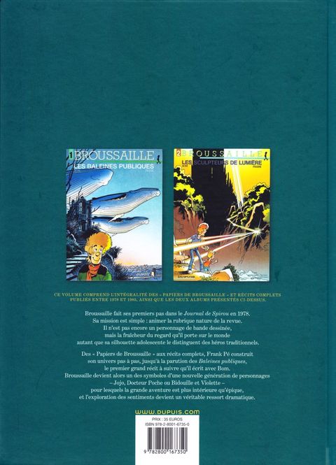 Quand il paraît en 1978 dans les pages du Journal de Spirou, "Broussaille" se distingue par son ton décalé. En pleine époque "disco", ce personnage attachant vagabonde dans un univers où la poésie est au coin de la rue : "Faire de la poésie, mais jamais de la mièvrerie. Faire de la poésie un peu rugueuse. C'est pour cela que j'ai choisi le nom de "Broussaille". "Les baleines publiques", le premier album, définit alors les codes de la série et synthétise à lui seul l'esprit de Frank Pé, son auteur, artiste protéiforme. Cette intégrale (en 2 volumes) reprend l'entièreté des "Papiers de Broussaille" et des récits complets parus dans Le journal de Spirou entre 1978 et 1985, ainsi que les albums "Les baleines publiques" et "Les sculpteurs de lumière". Quarante ans plus tard, ces pages, annonciatrices du grand talent de Frank Pé, n'ont rien perdu de leur fraîcheur.