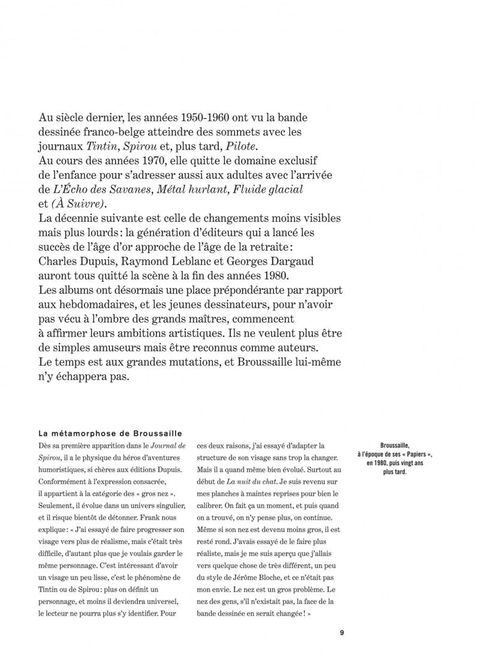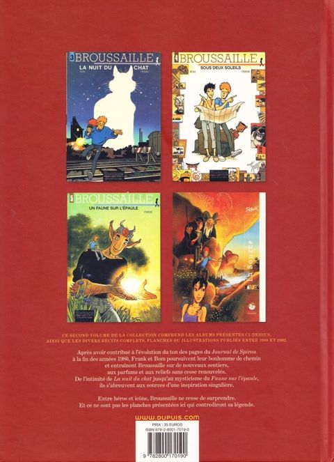 Après avoir bouleversé les pages du Journal Spirou par son esprit poétiquement naturaliste, le monde de Broussaille se développe. En trois albums marquants, Frank Pé et Bom explorent des univers radicalement différents. Depuis l'intimiste "Nuit du chat" où Broussaille, parti à la recherche de son chat, redécouvre son quartier, tel un monde parallèle, jusqu'à "Un faune sur l'épaule", où le jeune homme exprime son regard philosophique, voire allégorique de la vie, les deux auteurs se découvrent et révèlent, à travers un même personnage, de nouvelles façons de faire de la bande dessinée. Ce second volume de l'intégrale reprend une introduction très documentée, des récits complets parus dans Le journal de Spirou entre 1988 et 2002, ainsi que les albums "La nuit du chat" et "Un faune sur l'épaule".
