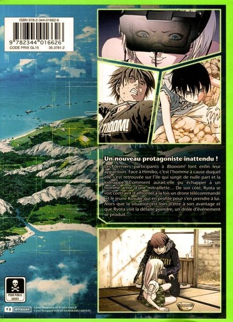Les derniers participants à Btooom ! font enfin leur apparition. Face à Himiko, c'est l'homme à cause duquel elle s'est retrouvée sur l'île qui surgit de nulle part et la kidnappe. Comment aurait-elle pu échapper à un homme armé d'une mitraillette... De son côté, Ryota se voit contraint d'affronter à la fois un drone télécommandé et le jeune Kosuke qui en profite pour s'en prendre à lui. Alors que la situation est loin d'être à son avantage et que Ryota voit la défaite poindre, un drôle d'événement se produit...