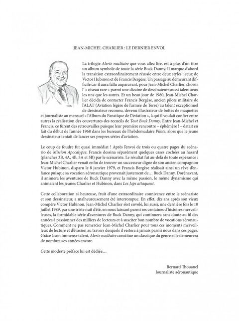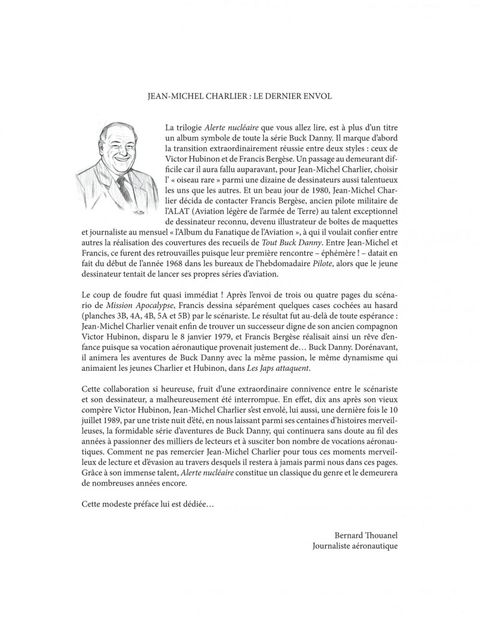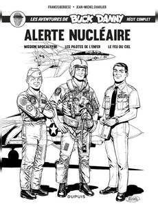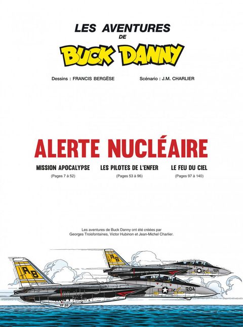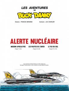 Initialement créée par Jean-Michel Charlier, Victor Hubinon et Georges Troisfontaines, la série Buck Danny est rapidement devenue la référence en matière de bande dessinée d'aviation, passionnant petits et grands, allant même jusqu'à déclencher de nombreuses vocations aéronautiques. Charlier et Hubinon, eux-mêmes férus d'aviation, iront jusqu'à passer leur brevet de pilote pour apporter plus d'authenticité à leur série. Débutée en 1947, celle-ci s'étoffe au fi l des albums, devenant de plus en plus réaliste, le summum étant atteint avec cette trilogie, qui fait littéralement entrer Buck Danny dans l'ère des jets modernes, la précision presque clinique des dessins de Francis Bergèse apportant une touche supplémentaire au dessin très dynamique d'Hubinon. La trilogie d'Alerte nucléaire s'inspire de faits réels (crash d'un bombardier atomique, montée du terrorisme international) pour proposer une intrigue digne des plus grands thrillers, non sans laisser la part belle à l'humour, avec l'inénarrable Sonny Tuckson qui, ici, se surpasse littéralement. Quant à la dimension géopolitique, elle prend une ampleur encore jamais vue dans la série, crédibilisant sur le fond une histoire menée de main de maître par un Jean-Michel Charlier au sommet de son art, que Francis Bergèse sublimera par l'hyperréalisme de son dessin. La légende continue.