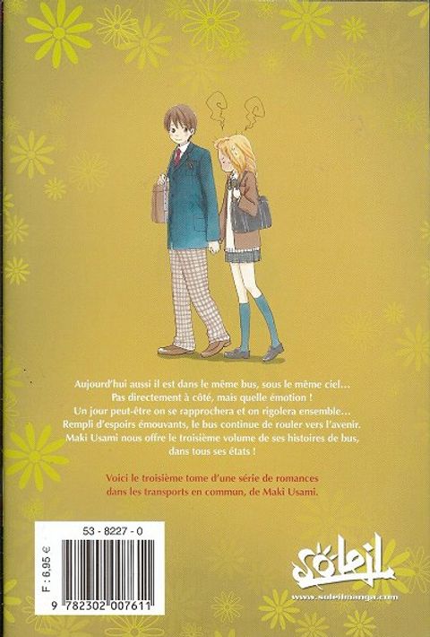 Aujourd'hui aussi l Il est dans le même bus, sous le même ciel... Pas directement à côté, mais quelle émotion ! Un jour peut-être on se rapprochera et on rigolera ensemble... Rempli d'espoirs émouvants, le bus continue de rouler vers l'avenir. Maki Usami nous offre le troisième volume de ses histoires de bus, dans tous ses états ! Voici le troisième tome d'une série de romances dans les transports en commun, de Maki Usami.