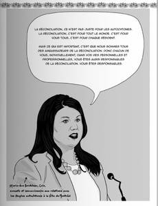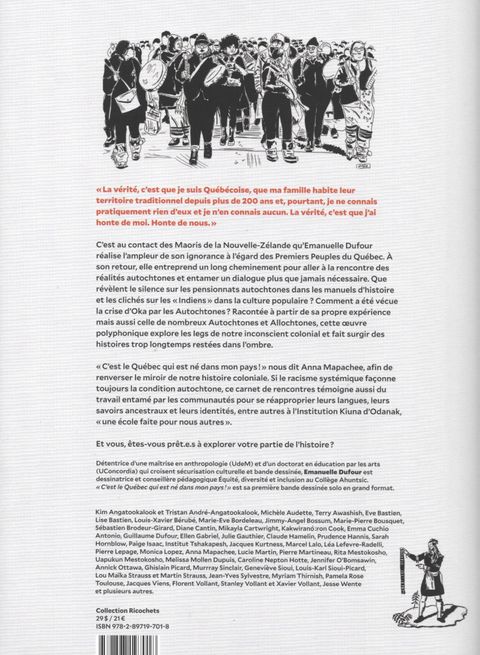 "La vérité, c'est que je suis Québécoise, que ma famille habite leur territoire traditionnel depuis plus de 200 ans et, pourtant, je ne connais pratiquement rien d'eux et je n'en connais aucun. La vérité, c'est que j'ai honte de moi. Honte de nous". C'est au contact des Maoris de la Nouvelle-Zélande qu'Emanuelle Dufour réalise l'ampleur de son ignorance à l'égard des Premiers Peuples du Québec. A son retour, elle entreprend un long cheminement pour aller à la rencontre des réalités autochtones et entamer un dialogue plus que jamais nécessaire. Que révèlent le silence sur les pensionnats autochtones dans les manuels d'histoire et les clichés sur les "? Indiens ? " dans la culture populaire ? Comment a été vécue la crise d'Oka par les Autochtones ? Racontée à partir de sa propre expérience mais aussi celle de nombreux Autochtones et Allochtones, cette oeuvre polyphonique explore les legs de notre inconscient colonial et fait surgir des histoires trop longtemps restées dans l'ombre. "C'est le Québec qui est né dans mon pays ! " nous dit Anna Mapachee, afin de renverser le miroir de notre histoire coloniale. Si le racisme systémique façonne toujours la condition autochtone, ce carnet de rencontres témoigne aussi du travail entamé par les communautés pour se réapproprier leurs langues, leurs savoirs ancestraux et leurs identités, entre autres à l'Institution Kiuna d'Odanak, "une école faite pour nous autres" . Et vous, êtes-vous prêt. e. s à explorer votre partie de l'histoire ? Avec les témoignages et citations autorisés de Kim Angatookalook et Tristan André-Angatookalook, Michèle Audette, Terry Awashish, Eve Bastien, Lise Bastien, Louis-Xavier Bérubé, Marie-Eve Bordeleau, Jimmy-Angel Bossum, Marie-Pierre Bousquet, Sébastien Brodeur-Girard, Diane Cantin, Mikayla Cartwright, Kakwiranó : ron Cook, Emma Cuchio Antonio, Guillaume Dufour, Ellen Gabriel, Julie Gauthier, Claude Hamelin, Prudence Hannis, Sarah Hornblow, Paige Isaac, Institut Tshakapesh, Jacques Kurtness, Marcel Lalo, Léa Lefevre-Radelli, Pierre Lepage, Monica Lopez, Anna Mapachee, Lucie Martin, Pierre Martineau, Rita Mestokosho, Uapukun Mestokosho, Melissa Mollen Dupuis, Caroline Nepton Hotte, Jennifer O'Bomsawin, Annick Ottawa, Ghislain Picard, Murrray Sinclair, Geneviève Sioui, Louis-Karl Sioui-Picard, Lou Maïka Strauss et Martin Strauss, Jean-Yves Sylvestre, Myriam Thirnish, Pamela Rose Toulouse, Jacques Viens, Florent Vollant, Stanley Vollant et Xavier Vollant, Jesse Wente et plusieurs autres.