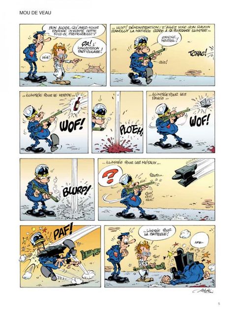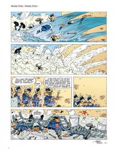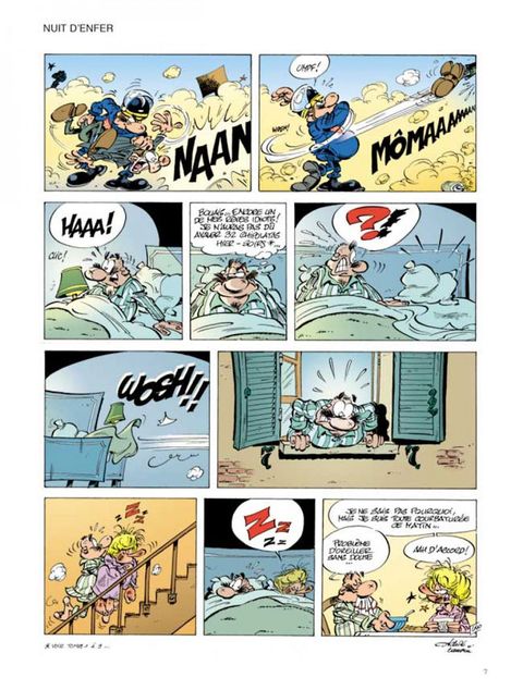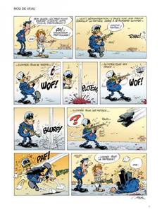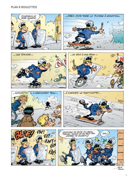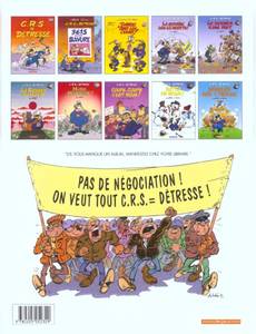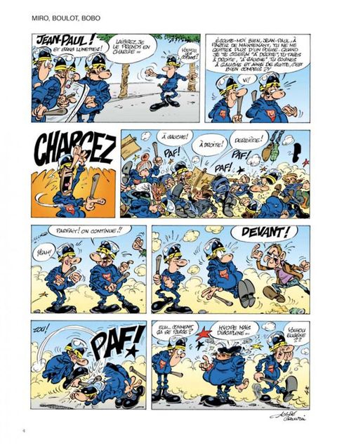 C'est le printemps ! Les amoureux cueillent les fleurs, merveilleux signes avant-coureurs du renouveau de mère nature. Eugène Lacrymo, notre Gégène à nous, n'a même pas à se baisser pour ramasser les nouveaux pavés qui vrombissent dans l'air printanier. C'est livraison à domicile. D'autant que la maison Comte Andan, fournisseur attitré de tout ce qui conteste et manifeste, vient de recevoir un nouveau modèle : joli robe, beau granit gris souris, bien équilibré en main, design parfait, ligne d'avant ? garde, poids idéal, il renvoie au musée la vieille relique de 68 que votre papa vous a légué avec des sanglots dans la voix (publique). C'est aussi le printemps pour Pamela, la CRS un tantinet obsédée sexuelle qui peut enfin dévoiler ses jolies formes. Ses collègues adoptent aussi sec le profil bas. Car la collègue ne pense qu'à " ça ". Toujours volontaire pour les séances de secourisme la Pamela, surtout lors des cours de bouche-à-bouche. À propos de bouche-à-bouche, un qui aurait dû se méfier, c'est Gédéon, le fiston de Gégène. Embrasser un crapaud peut avoir des conséquences familiales insoupçonnées. Notez que le lancer de manifestant, une spécialité Gégène, a aussi de fâcheuses répercussions sur sa vie familiale, en particulier nocturne. Chaque métier à ses petits ennuis. Et ses dommages collatéraux ! On ne remerciera jamais assez Achdé et Cauvin d'avoir osé montrer les risques pris par de pauvres CRS obligés de taper, qui sur un médecin, qui sur un moniteur de saut à l'élastique. Ou encore d'avoir accepté de divulguer comment un être sensible, sain et équilibré tel qu'Eugène Lavcrymo, peut se retrouver coiffé d'une flamboyante coiffure indienne ou le corps couvert de bien curieuses peintures de guerre (urbaine). Un grand merci aussi aux auteurs pour leur contribution constante à l'enrichissement du vocabulaire des rues. " Cressons de latrines, couillons de la lune, croupions mouillés, testicules de mulets, Chtouille de yeti, tréponèmes asmathiques, zézettes de canaris" feront, c'est sûr, la joie de tous !