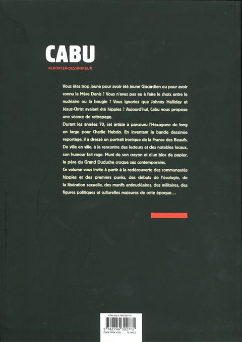 Un regard unique sur la société des années 70. Vu à travers les dessins d'un des plus grands dessinateur humoristique de presse... Depuis la fin des années 60, Cabu a parcouru la France de long en large pour le journal 'Charlie Hebdo'. En inventant la bande dessinée reportage, il a dressé un portrait politique et sociologique de l'Hexagone. De ville en ville, à la rencontre des lecteurs et des notables locaux, son humour fait rage. Muni de son crayon et d'un bloc de papier, le père du Grand Duduche croque ses contemporains. Dans ce volume consacré aux années 70, les lecteurs découvriront ou redécouvriront les communautés hippies et les premiers punks, le début de l'urbanisation intensive, la libération sexuelle, les centralesnucléaires, les militaires, les figures politiques majeures de l'époque, Pompidou, Giscard, Marchais, Chirac et déjà notre monument national, Johnny Halliday ! La culture également est passée au crible, qu'elle soit cinématographique, théâtrale, télévisuelle ou musicale. Ces voyages dans le temps seront accompagnés de repères « historiques » et des commentaires de l'auteur. Plus de 200 pages de dessins d'archives compilés et sélectionnés par le maître d'oeuvre Alain David.