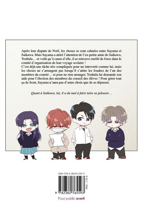 Après leur dispute de Noël, les choses se sont calmées entre Sayama et Saikawa. Mais Sayama a attiré l'attention de l'ex-petite amie de Saikawa, Yoshida... et voilà qu'à cause d'elle, il se retrouve enrôlé de force dans le comité d'organisation de leur voyage scolaire !C'est déjà une tâche très compliquée pour un introverti comme lui, mais les choses ne s'arrangent pas lorsqu'il s'attire les foudres de l'un des membres du comité... et pour ne rien arranger, Yoshoda lui demande son aide pour l'élection des membres du conseil des élèves ! Pour gérer tout ça de front, Sayama n'aura pas d'autre choix que de se dépasser.