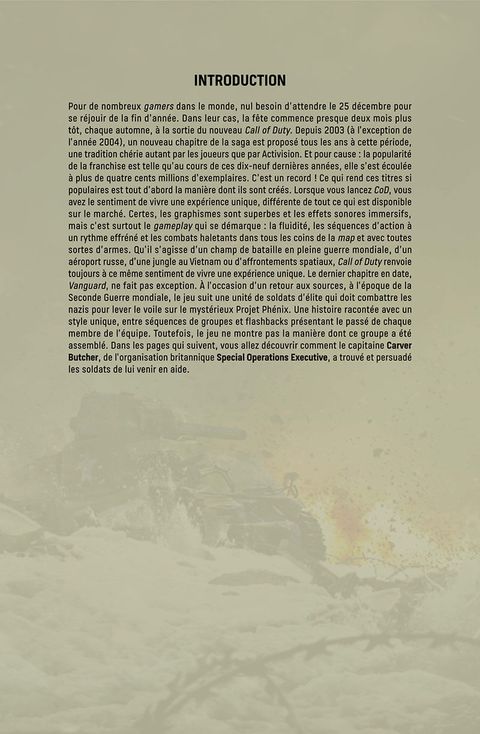 L'équipe spéciale Vanguard s'est faite une réputation qui fait trembler l'ennemi ! Mais comment s'est formé le groupe et qui sont ses membres ? Découvrez tout ce qu'il faut savoir sur la naissance de ces héros de la Seconde Guerre mondiale, menés par le capitaine Carver Butcher. La série de jeux Call of Duty est toujours aussi populaire, et l'équipe Vanguard qui a fait son apparition dans le scénario de campagne du même nom, a ses aficionados. La mini-série complète vous est présentée en intégralité dans cet album !