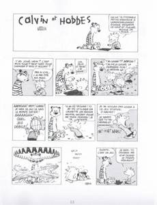L'enfance est pleine de désillusions et pleine d'inventions aussi. Heureusement Calvin, petit garçon de 6 ans, un peu turbulent, déborde d'imagination. Aidé de son fidèle tigre en peluche et compagnon Hobbes, il sait rendre la vie piquante et drôle. Tout le monde y passe : les parents, les filles, la maîtresse d'école. Mais la principale activité de ce tendre Calvin est d'animer le club le D.E.F.I. (Dehors énormes filles informes), dont Calvin et Hobbes sont seuls membres actifs, et ils se déchaînent sur la pauvre Susie Derkins.Les strips de Bill Waterson, couronné Alph-Art du meilleur étranger à Angoulême en 1992, étaient une véritable institution outre-Atlantique où quotidiennement les lecteurs se régalaient de ses aventures dans le journal. Depuis le 1er janvier 1996, Bill Waterson a décidé d'arrêter la publication quotidienne des strips. Mais heureusement pour la France, la traduction des aventures de Calvin et Hobbes a toujours cours ! On pourrait piocher à loisir les petites phrases assassines sur la société, qui montrent à quel point la vérité sort bien mieux de la bouche des enfants ! Tout le monde en prend pour son grade et c'est pour ça que c'est drôle.<blockquote>- Calvin : la plupart des gens pataugent toute leur vie ! Ils sont passifs, ils n'ont ni motivation ni ambition ! Ce n'est pas mon cas, j'aurai une existence épique ! Je vais affronter les problèmes de mon temps et changer le cours de l'histoire !- Hobbes : Comment vas-tu t'y prendre ?- Calvin : je vais rester assis là, comme ça le destin saura où me trouver quand le temps sera venu de changer le monde.- Hobbes : J'aurais dû prendre un bouquin.- Calvin : C'est une question de minutes maintenant.lockquote> --Nadia Picard