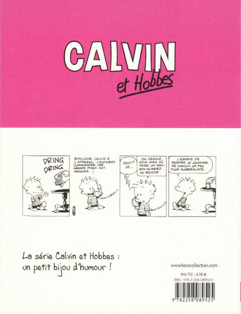 Revoilà les aventures de Calvin, ce petit garçon, in-su-por-table, donc que l'on adore ! et de son tigre en peluche, Hobbes, compagnon indissociable du petit bonhomme, et qui ne parle qu'à lui... Attention fous rires en vue, choubidouwouah !!!