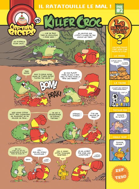 Le retour du plus balèze des super-héros ! Ses os sont en acier et ses muscles en béton, vous l’aurez compris, Captain Biceps, l’homme le plus fort de la planète est de retour !Après avoir cassé la figure à un nombre incalculable de gugusses, Captain Biceps traverse cette fois le multivers pour affronter des ennemis de toutes galaxies et de tous horizons. De Marvel au manga, en passant par Minecraft, tout le monde va casquer lorsd’affrontements hilarants, dont notre héros sort toujours victorieux, mais pas toujours glorieux… Justicier injustement oublié par l’Histoire, le super-héros imaginé par le créateur de Titeuf, Zep et illustré avec les super-dessins de Tébo, débarque après une longue absence dans des gags courts, méga-drôles et complètement déjantés. Un seul mot d’ordre : tous à couvert !