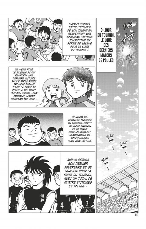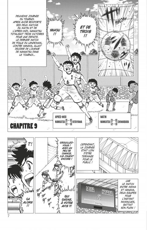Le dernier match de poule de Nankatsu, qui va sceller l'avenir de l'équipe dans le tournoi, est lancé ! La très défensive équipe de Hanawa, qui confie l'intégralité de son attaque aux jumeaux Tachibana, ne peut empêcher Tsubasa et Misaki d'ouvrir le score. Cependant, les jumeaux cachent un atout dans leur manche, sous la forme d'un spectaculaire football aérien...