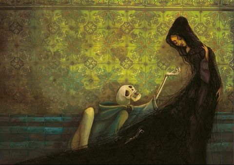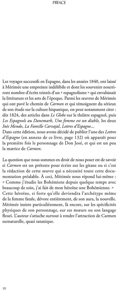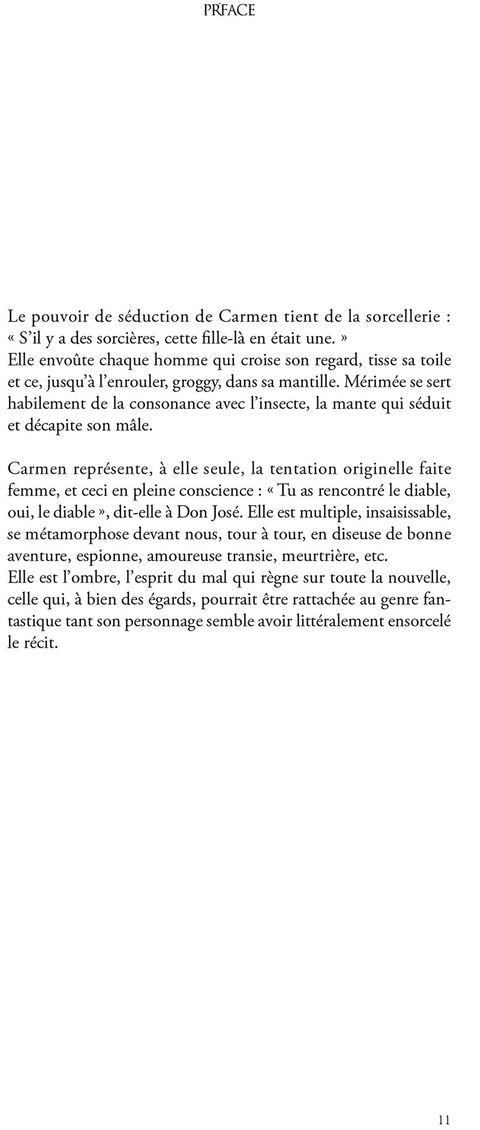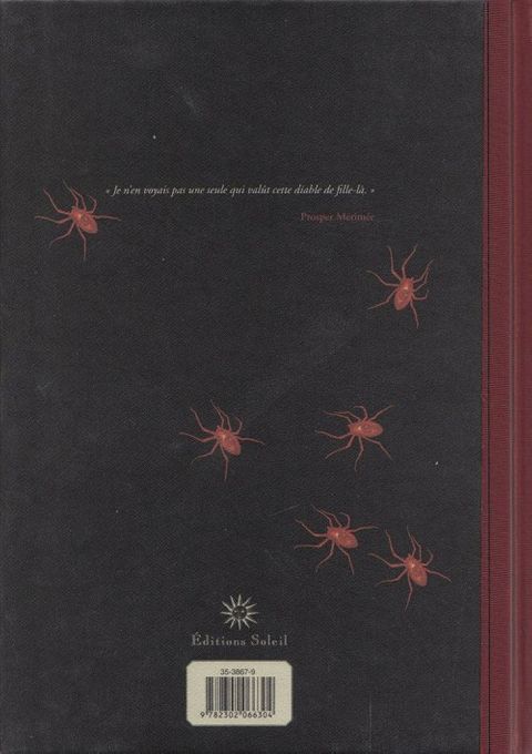 Carmen est une nouvelle de Prosper Mérimée écrite en 1845, dont a été tiré l'opéra-homonyme, musique de Georges Bizet, livret de Henri Meilhac et Ludovic Halévy (1875). En Espagne, à Séville. Arrêtée à la suite d'une querelle, Carmen, bohémienne au tempérament de feu, séduit le brigadier Don José, et lui promet son amour s'il favorise son évasion... Benjamin Lacombe s'est attaché à mettre à l'honneur l'aura de cette femme fatale à travers ses particularités physiques, avec l'envie de la rendre surnaturelle, envoûtante, quasi satanique. Il a utilisé des huiles et des gouaches pour les images en couleurs et de l'encre de chine pour les cabochons.
