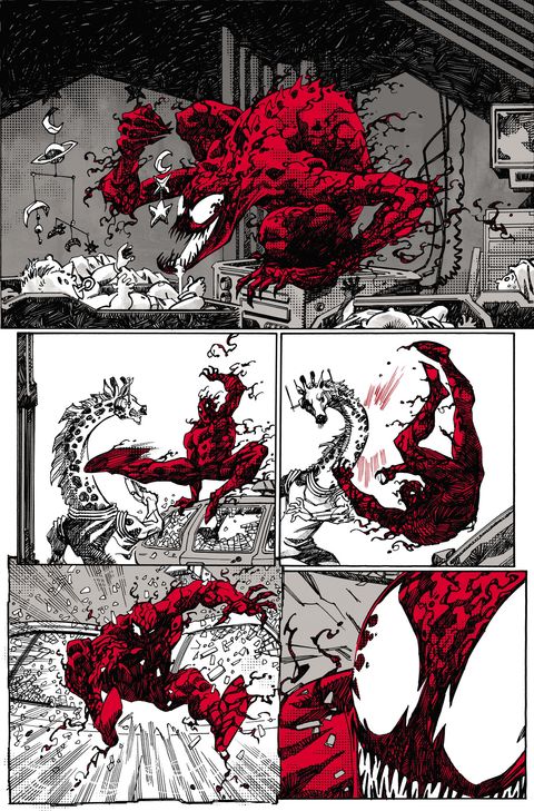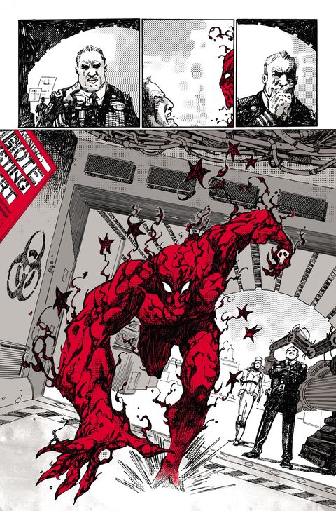 Cletus Kasady, alias Carnage, est très certainement l'un des vilains les plus sanguinaires de l'univers Marvel, et encore vous ne savez pas tout ! Découvrez une série d'histoires inédites du célèbre tueur en série, racontées dans un magnifique format noir, blanc et rouge ! Comme pour l'album WOLVERINE : BLACK, WHITE & BLOOD, nous voyons les choses en grand pour cette anthologie d'histoires consacrées à Carnage. Dans cet album grand format, vous retrouverez les meilleurs auteurs Marvel : Al Ewing, Benjamin Percy, Dan Slott, Donny Cates, Sara Pichelli, John McCrea, Marco Checchetto, Kyle Hotz...