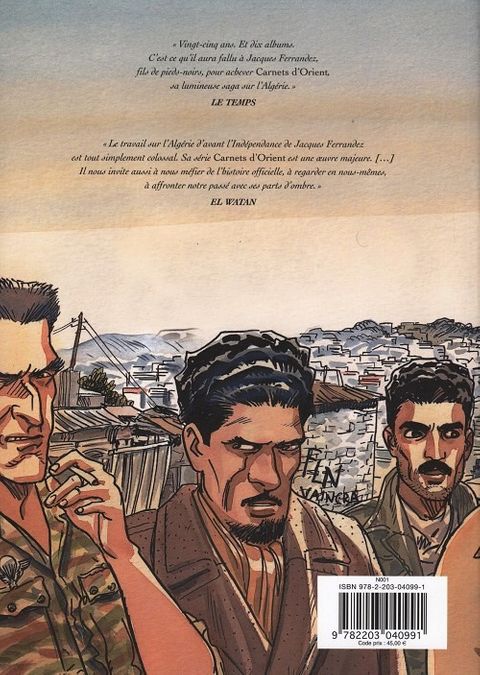La série Carnets d'Orient retrace, par l'entremise de la fiction, les deux derniers siècles de l'histoire de l'Algérie, de sa conquête par la France en 1830 à son indépendance au début des années 60. Une oeuvre forte sur une période majeure de notre histoire récente, dont les échos résonnent avec force dans notre actualité. La série est aussi une manière pour Jacques Ferrandez, lui-même né en Algérie, de redécouvrir ses propres origines. Après un premier tome regroupant les cinq épisodes du premier cycle narratif de la série, le second volume de cette intégrale rassemble en un volume unique les cinq titres du second cycle (La Guerre fantôme, Rue de la bombe, La fille du Djebel Amour, Dernière demeure et La Valise ou le cercueil), qui commence en 1954, à la veille de l'insurrection. Bonus : en complément de l'album, un carnet de voyage nourri de textes et de dessins de Ferrandez, retraçant à travers divers documents sa manière de travailler sur cette série.