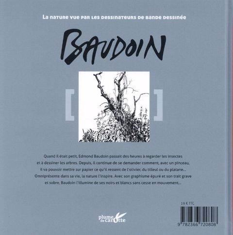 Quand Edmond Baudoin, le grand dessinateur, spécialiste du noir et blanc, nous offre son regard personnel sur la nature... Cette nouvelle collection est dédiée aux dessinateurs de bandes dessinées, à ces adeptes du croquis, qui dès que leur regard se pose, sortent de manière quasi automatique un petit carnet, un crayon, voire des pastels. Le regard vif, la main agile, le croqueur fou permet aux éléments de prendre forme, souvent en noir et blanc, parfois en couleur, sur le papier. Et le passant, qui jette un regard curieux, par-dessus l'épaule du dessinateur, est fasciné par tant de magie. Chaque volume de cette collection donne la parole à un dessinateur de bande dessinée et présente le regard qu'il porte sur la nature et sur l'environnement. Des croquis et dessins réalisés bien souvent en dehors de tout album mais aussi des esquisses faites à l'occasion de repérages, des crayonnés annonciateurs de cases. L'ensemble fait de la nature, non pas un second plan ou un décor quelconque dans lequel le héros se glisse, mais un véritable personnage qui montre l'investissement et l'intérêt du dessinateur. Un temps de respiration, un moment de calme ou une volonté de mettre en avant des éléments qui vont à un moment porter l'action ! Cette collection est dirigée par Dominique Dupuis. Edmond Baudoin est né en 1942. Son premier album Sentiers Cimentés est publié par Futuropolis en 1979. Après avoir publié neuf albums chez Futuropolis, il collabore avec les Humanoïdes Associés, Casterman, Le Seuil, L'Association. Il a reçu le prix du meilleur album en 1991 pour Couma Aco et reçoit en 1997 et 2001 « l'Alph Art » du meilleur scénario. Ses croquis sont autant une ode au noir et blanc qu'une ode à la nature et il accorde, en natif de Nice, une large place au paysage méditerranéen. Il est aujourd'hui considéré comme le père et le principal inspirateur de la jeune bande desssinée française, que ce soit Lewis Trondheim ou Manu Larcenet. - Une collection dédiée aux dessinateurs de BD - Un recueil inédit de dessins - Un regard fort et original sur la nature