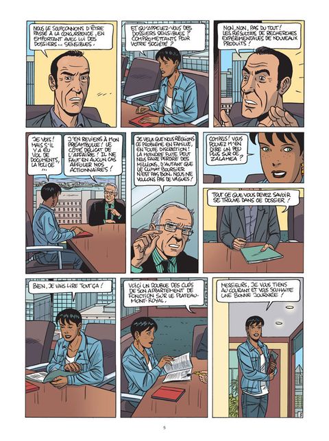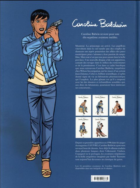 Montréal. Le printemps est arrivé. Les papillons virevoltent dans le ciel tandis que des couples de danseurs ont repris possession des allées des parcs municipaux pour s'adonner a leur passion du tango-libre. Mais tout n'est pas rose pour autant dans la belle province. Une nouvelle drogue a fait son apparition, causant des ravages dans le milieu des toxicomanes et de la prostitution. C'est dans ce cadre bucolique que nous retrouvons Caroline Baldwin, enquêtrice chez Wilson Investigation, sur les traces d'un certain Juan Zalamea. Celui-ci, brillant scientifique, n'a plus donné signe de vie au laboratoire pharmaceutique qui l'emploie. Le plus gênant est qu'il a emporté avec lui quelques documents sensibles qui, aux dires du laboratoire, pourraient bien intéresser ses concurrents... Narco-Tango est la dix-septième enquête de Caroline Baldwin. Note: plusieurs réimpressions avec dos différents mais même EAN