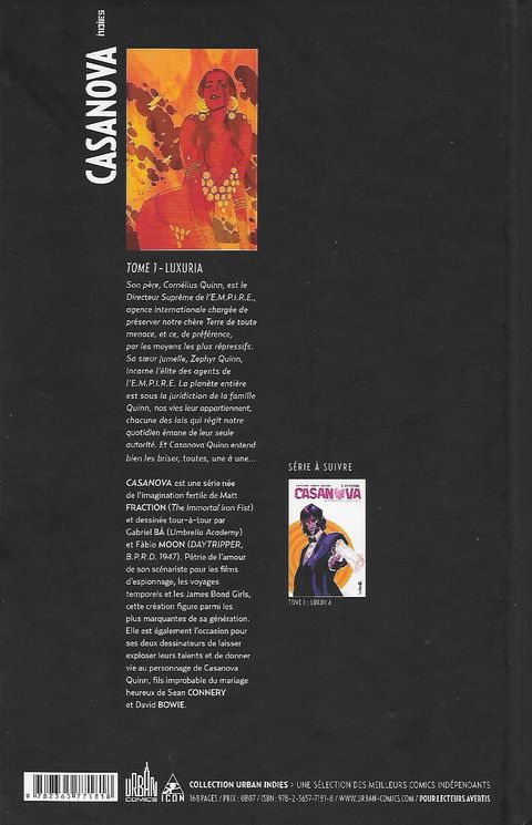 Son père, Cornélius, est le Directeur Suprême d’E.M.P.I.R.E., agence internationale chargée de préserver notre chère Terre de toute menace, et ce, de préférence, par les moyens les plus répressifs qui soient. Sa soeur jumelle, Zephyr, incarne l’élite des agent d’E.M.P.I.R.E., et enquête actuellement sur une anomalie dans le continuum espace-temps. La planète entière est sous la juridiction de la famille Quinn, nos vies leur appartiennent, chacune des lois qui régit notre quotidien émane de leur seule autorité. Et Casanova Quinn entend bien les briser, toutes, une à une…