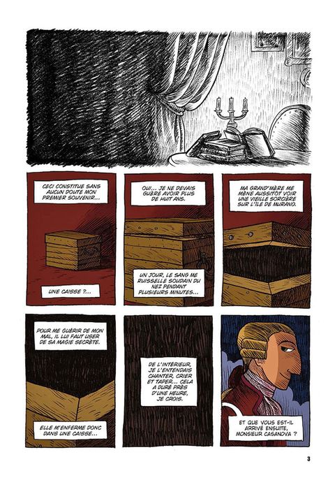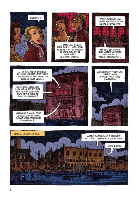 Venise, juillet 1755. Giacomo Casanova, célèbre gentilhomme de la Sérénissime et coureur de ces dames, est arrêté et mis aux fers dans les redoutables « plombs de Venise ». Les raisons de cet emprisonnement ? Lui-même l’ignore. Toujours est-il que son monde de faste et de débauche se résume maintenant à une cellule obscure et étroite sous les combles du palais des Doges, avec pour seule compagnie l’incommode gardien Lorenzo. Casanova sait qu’il ne pourra pas décemment rester longtemps dans cet enfer, aussi décide-t-il de tout mettre en œuvre pour s’évader… Patrick Mallet nous livre de son trait expressif et faussement naïf un huis clos oppressant et saisissant, librement adapté des écrits de Casanova lui-même. Initialement parue en 3 albums, cette série [Treize étrange] est ici rééditée en intégrale.