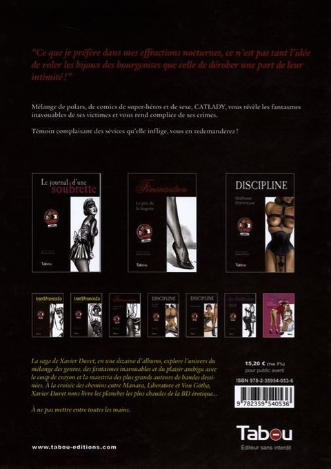 À première vue, the catlady ne serait que les aventures d'une simple voleuse de bijoux passant par les toits pour s'introduire chez ses victimes… Mais un deuxième regard rend le lecteur complice de cette voleuse qui fait plus que s'introduire chez les gens pour leur voler une tranche de vie privée, d'intimité… et en abuser. Finalement cette BD n'est-elle pas une critique légère de notre société qui, au fil des méfaits de son héroïne, va jeter un regard acerbe sur une certaine forme de bourgeoisie, se moquer de la police, des hommes volages, des rapports sexuels et même de la classe politique? Une œuvre en noir et blanc réalisée entièrement à l'aérographe qui offre dans cette version quatre pages inédites.