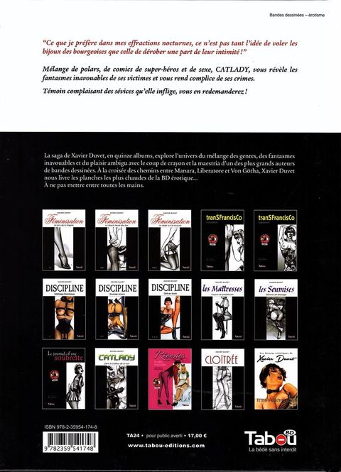 À première vue, the catlady ne serait que les aventures d'une simple voleuse de bijoux passant par les toits pour s'introduire chez ses victimes… Mais un deuxième regard rend le lecteur complice de cette voleuse qui fait plus que s'introduire chez les gens pour leur voler une tranche de vie privée, d'intimité… et en abuser. Finalement cette BD n'est-elle pas une critique légère de notre société qui, au fil des méfaits de son héroïne, va jeter un regard acerbe sur une certaine forme de bourgeoisie, se moquer de la police, des hommes volages, des rapports sexuels et même de la classe politique? Une œuvre en noir et blanc réalisée entièrement à l'aérographe qui offre dans cette version quatre pages inédites.