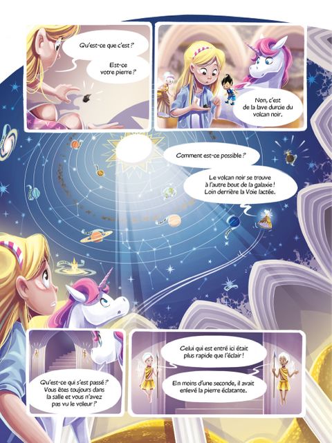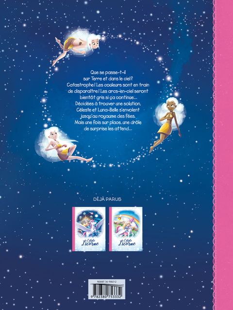 Que se passe-t-il sur Terre et dans le ciel ? Catastrophe ! Les couleurs sont en train de disparaître ! Les arcs-en-ciel seront bientôt gris si ça continue... . Décidées à trouver une solution, Céleste et Luna-Belle s'envolent jusqu'au royaume des fées. Là, elles apprennent que la pierre éclatante, qui donne la couleur à tous les objets sur la Terre, a été volée ! Un indice les guide vers le volcan noir... Malgré le danger, il est grand temps d'y aller car bientôt, c'est le jaune qui disparaîtra et ainsi donc le beau soleil...