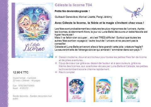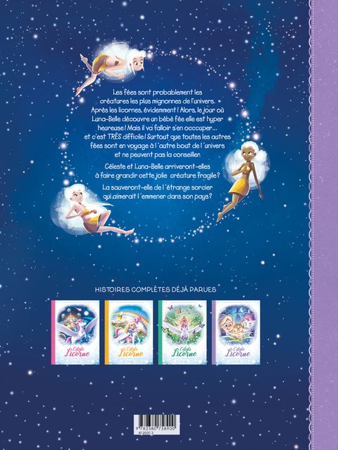 Les fées sont probablement les créatures les plus mignonnes de l’univers. Après les licornes, évidemment! Alors, le jour où Luna-Belle découvre un bébé fée elle est hyper heureuse !Mais il va falloir s’en occuper… et c’est TRÈS difficile ! Surtout que toutes les autres fées sont en voyage à l ‘autre bout de l ‘univers et ne peuvent pas la conseiller. Céleste et Luna-Belle arriveront elles à faire grandir cette jolie créature fragile?La sauveront-elle de l’étrange sorcier qui aimerait l ‘emmener dans son pays ?