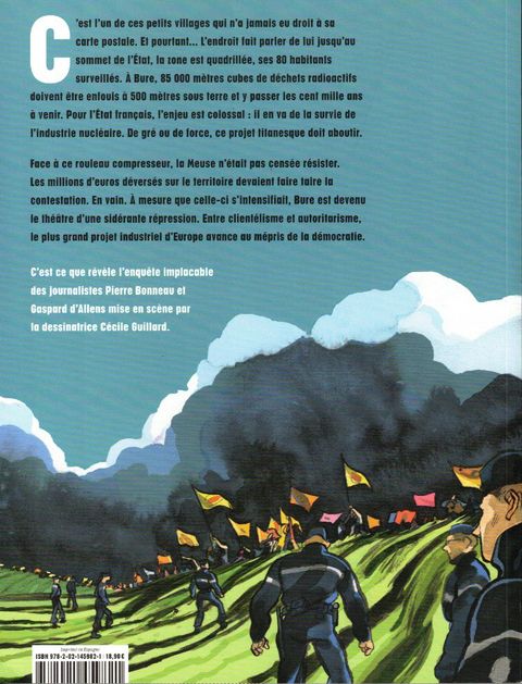 C'est l'un de ces petits villages qui n'a jamais eu droit à sa carte postale. Et pourtant... L'endroit fait parler de lui jusqu'au sommet de l'Etat, la zone est quadrillée, ses 80 habitants surveillés. A Bure, 85 000 mètres cubes de déchets radioactifs doivent être enfouis à 500 mètres sous terre et y passer les cent mille ans à venir. Pour l'Etat français, l'enjeu est colossal : il en va de la survie de l'industrie nucléaire. De gré ou de force, ce projet titanesque doit aboutir. Face à ce rouleau compresseur, la Meuse n'était pas censée résister. Les millions d'euros déversés sur le territoire devaient faire taire la contestation. En vain. A mesure que celle-ci s'intensifiait, Bure est devenu le théâtre d'une sidérante répression. Entre clientélisme et autoritarisme, le plus grand projet industriel d'Europe avance au mépris de la démocratie. C'est ce que révèle l'enquête implacable des journalistes Pierre Bonneau et Gaspard d'Allens mise en scène par Cécile Guillard. Journaliste pour le site Reporterre, Gaspard d'Allens est l'auteur de plusieurs livres traitant d'écologie. Le dernier en date : Main basse sur nos forêts, a paru au Seuil en 2019. Journaliste indépendant, Pierre Bonneau travaille sur les mouvements sociaux et la criminalisation des luttes. Il contribue notamment à Reporterre, Bastamag ou l'Humanité. Après avoir étudié l'illustration et le cinéma d'animation, Cécile Guillard se consacre à la bande dessinée. Cent mille ans est son deuxième album après Une vie de moche, avecFrançois Bégaudeau, paru chez Marabulle en 2019.