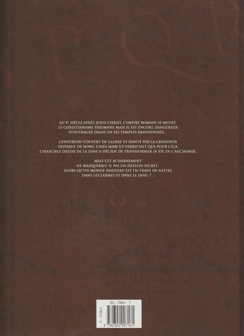 LE DESTIN DU PLUS GRAND CENTURION DE ROME DEVENU MALGRE LUI LE JOUET DE LA MACHIAVELIQUE DEESSE DIANE. Rome, Ve siècle. Pour avoir outragé Diane, la déesse païenne de la Lune, le jeune Caius Marcus Varro se retrouve nanti d'un «pouvoir» qui va empoisonner sa vie, celui d'être assailli par des cauchemars prémonitoires morbides les nuits de pleine lune. A chaque fois, son existence en sort bouleversée et sa vie remise en jeu... Devenu un des meilleurs centurions de l'armée romaine, Caius se retrouve au centre d'évènements qui vont forger l'histoire de la Rome agonisante et celle des peuples barbares, qui déferlent sur la Gaule. Hanté par l'ancienne grandeur de Rome au point d'arborer fièrement le "SPQR" tatoué sur son poignet, celui que l'on surnomme désormais «Le Centurion» va s'attaquer au chaos qui menace l'Empire pourri jusqu'à la moelle et, surtout, tenter d'apprendre la vérité sur l'étrange complot que Diane semble avoir tissé autour de lui depuis tant d'années...