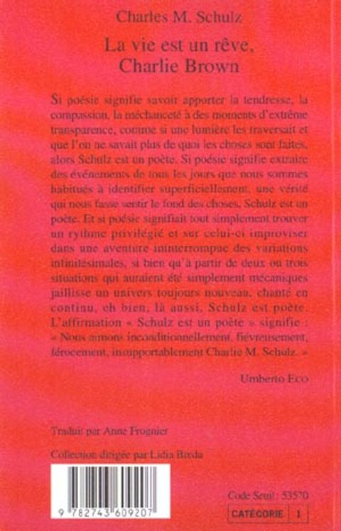 Si poésie signifie savoir apporter la tendresse, la compassion, la méchanceté à des moments d'extrême transparence, comme si une lumière les traversait et que l'on ne savait plus de quoi les choses sont faites, alors schulz est un poète. Si poésie signifie extraire des événements de tous les jours que nous sommes habitués à identifier superficiellement, une vérité qui nous fasse sentir le fond des choses, schulz est un poète. et si poésie signifiait tout simplement trouver un rythme privilégié et sur celui-ci improviser dans une aventure ininterrompue des variations infinitésimales, si bien qu'à partir de deux ou trois situations qui auraient été simplement mécaniques jaillisse un univers toujours nouveau, chanté en continu, eh bien, là aussi, schulz est poète. L'affirmation " schulz est un poète " signifie : " nous aimons inconditionnellement, fiévreusement, férocement, insupportablement charlie m. schulz. " umberto eco.