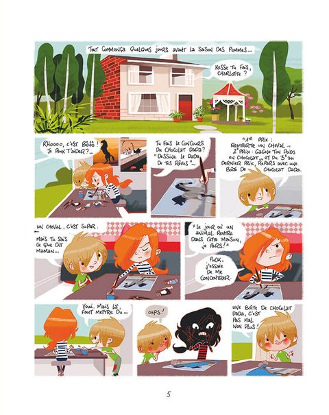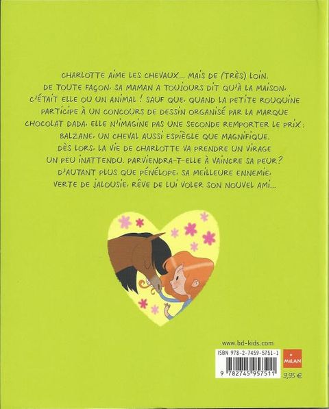 Charlotte est une petite rouquine un peu timide, passionnée de dessin. Un jour, sans trop y penser, elle participe à un concours organisé par une marque de chocolat... et elle gagne ! Le premier prix : Balzane, un facétieux cheval au crin sombre. Passée la première réaction de ses parents, Charlotte, son petit frère Puck et ses deux meilleures amies décident de faire face. C'est sans compter sur Pénélope, fille à papa pourrie gâtée qui verdit de jalousie depuis qu'elle a appris que Charlotte avait remporté le concours à sa place...