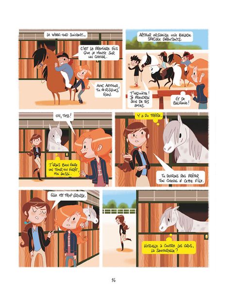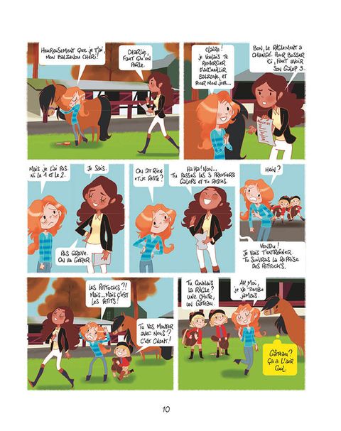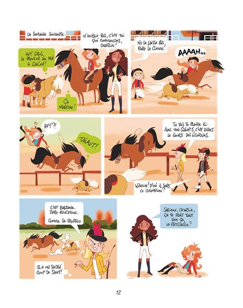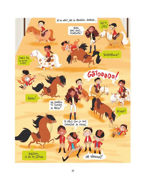 Charlotte travaille aux Écuries du rocher pour pouvoir y loger son cheval Balzane. Malheureusement, une nouvelle règle s'impose : elle doit passer son Galop 3 pour pouvoir y rester. En plus, une nouvelle arrivée va semer la pagaille aux écuries... Entre problèmes de copines, histoires d'amour et rivalités, Charlotte va avoir du mal à rester en selle ! Lorsque Charlotte apprend qu'elle doit passer son Galop 3 pour rester aux Écuries du rocher, c'est la panique ! Elle commence tout juste l'équitation et passe plus de temps au sol que sur sa selle... Surtout que quelqu'un sabote sans arrêt son matériel. En plus, la petite rouquine rêve d'un téléphone portable et doit se le payer elle-même ! Elle est donc ravie de rencontrer Tess, une jeune cavalière prête à la payer pour pouvoir monter Balzane. Sauf que cette nouvelle amitié risque sérieusement d'empiéter sur ses relations avec ses meilleures amies et son amoureux... Attention aux dégâts ! Sous le dessin tendre de Colonel Moutarde, on suit avec bonheur les aventures de cette adolescente et de la complicité qui l'unit à son cheval. Drôle et attachant !