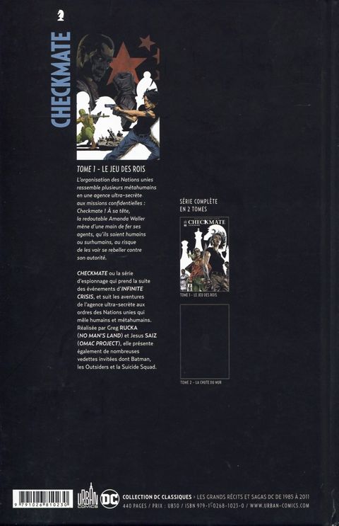 L'organisation des Nations Unies rassemble plusieurs métahumains en une organisation ultra-secrète aux missions confidentielles : Checkmate ! À sa tête, la redoutable Amanda Waller mène d'une main de fer ses agents, qu'ils soient humains ou surhumains, au risque de les voir se rebeller contre son autorité. Contenu : Checkmate Vol1: A King's Game (#1-7) + Vol.2: Pawn Breaks (#8-12) + Outsiders/Checkmate: Checkout (Outsiders #47-49, Checkmate #13-15)
