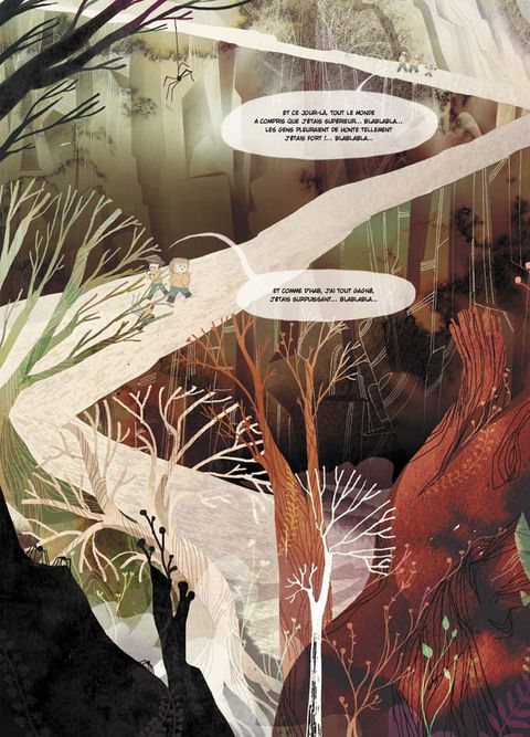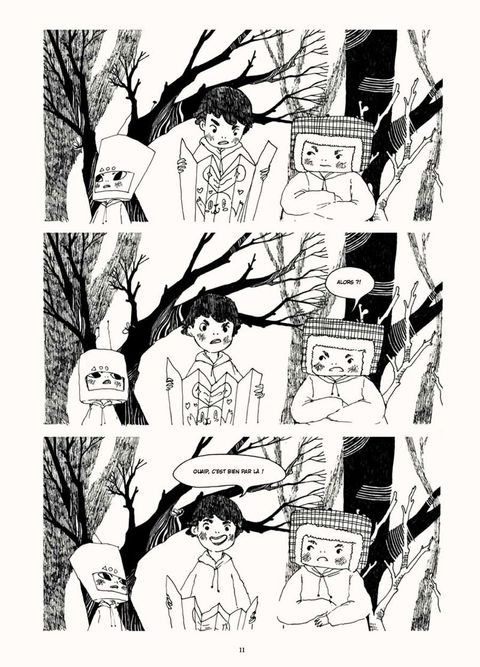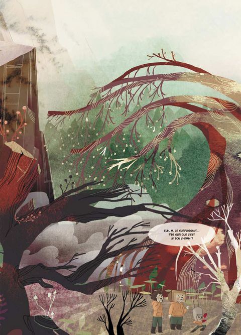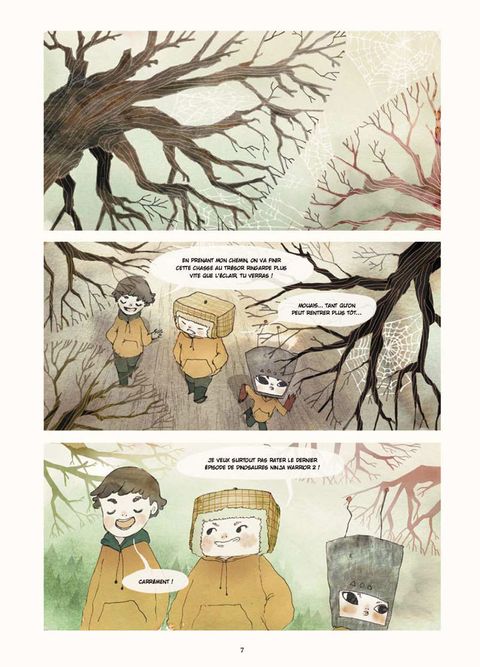 Vous qui possédez flair, sensibilité et goût de l'aventure, munissez-vous de votre carte des copinoux et lancez-vous dans cette fabuleuse chasse au trésor ! « T'es sûr qu'en passant par là, on va arriver plus vite ? ». Ainsi commence l'extraordinaire chasse au trésor lancée par Le Camp du bonheur. Munis d'une carte, «monsieur je-suis-le-meilleur», son petit frère qui s'imagine être un robot et leur copain, fils d'un chasseur en sont sûrs : ils seront les vainqueurs ! C'est simple, il leur suffi t de suivre « le chemin des arbres déguisés en apaches ». Mais c'était sans compter la rencontre d'étranges créatures oniriques : un cerf géant au chapeau melon magique, un renard à la poursuite de sa bicyclette folle, un ogre branchu ou encore, une fée aux intentions ambiguës... Mais où donc cet étonnant jeu de piste les mènera-t-il ? Une histoire exaltante qui emprunte à l'Europe la richesse de ses contes, au Japon la désinvolture de ses récits populaires, et qui offre une audacieuse mixité d'influences puisées dans l'animation et le manga.