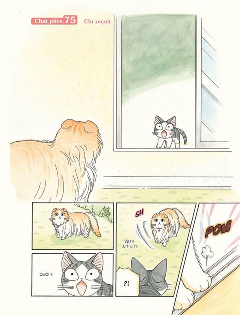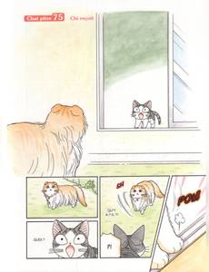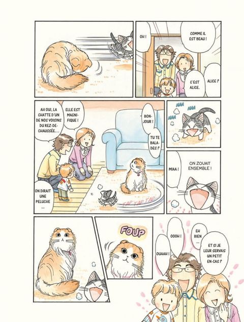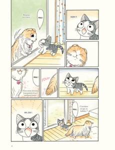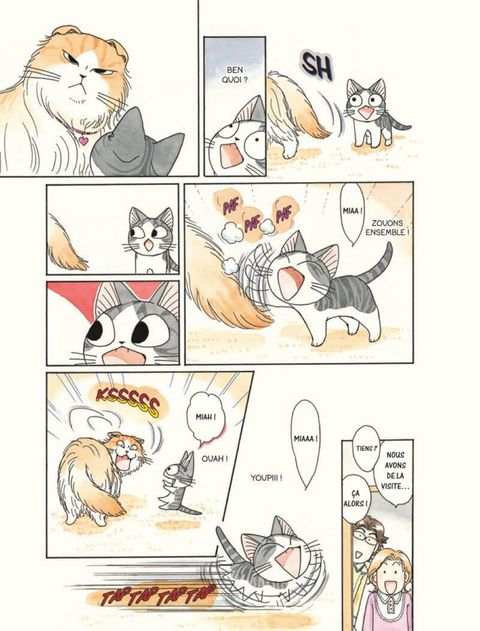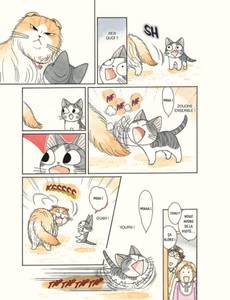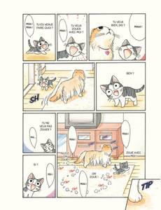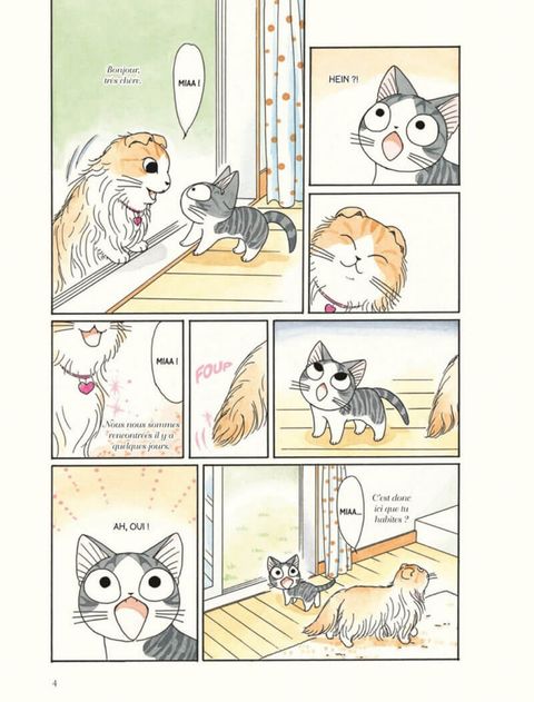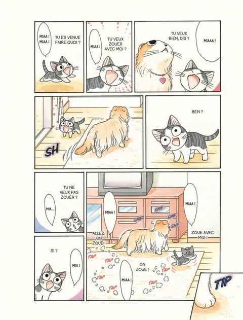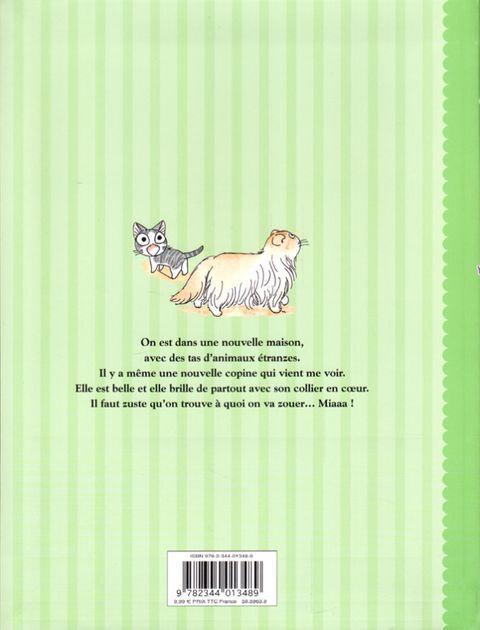 On est dans une nouvelle maison, avec des tas d'animaux étranzes. Il y a même une nouvelle copine qui vient me voir. Elle est belle et elle brille de partout avec son collier en coeur. Il faut zuste qu'on trouve à quoi on va zouer... Miaaa !