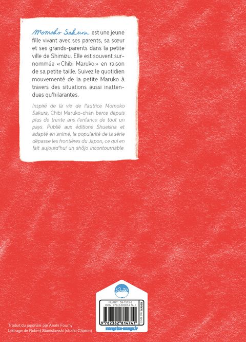 Momoko Sakura est une jeune fille vivant avec ses parents, sa soeur et ses grands-parents dans la petite ville de Shimizu. Elle est souvent surnommée Chibi Maruko en raison de sa petite taille. Suivez le quotidien mouvementé de la petite Maruko à travers des situations aussi inattendues qu'hilarantes.Inspiré de la vie de l'autrice Momoko Sakura, Chibi Maruko-chan berce depuis plus de trente ans l'enfance de tout un pays. Publiée aux éditions Shueisha et adaptée en animé, la popularité de la série dépasse les frontières du Japon, ce qui en fait aujourd'hui un shôjo incontournable.