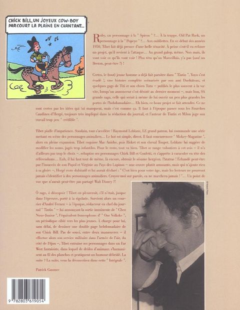 Roby, un personnage à la " Spirou " ?...A la trappe. Old Pat Rack, un personnage à la " Popeye " ?... Aux oubliettes. En ce début des années 1950, Tibet fait déjà preuve d'une belle ténacité. A peine s'est-il vu refuser un projet, qu'il revient à l'attaque... Au grand galop, même. Non mais, ils vont voir ce qu'ils vont voir ! Plus têtu qu'un Marseillais, y'a pas (sauf un Breton, peut-être ?) ! Certes, le (tout) jeune homme a déjà fait paraître dans " Tintin " Yoyo s'est évadé !, une histoire complète scénarisée par son ami Duchâteau, et quelques gags de Titi et son chien Tutu - publiés le plus souvent à la va-vite, lorsqu'un annonceur s'est désisté, au dernier moment -, mais bon, SA grande saga, celle qui serait à même de lui ouvrir un peu plus grandes les portes de l'hebdomadaire... Eh bien, ce beau projet se fait attendre. Ce ne sont certes pas les idées qui lui manquent, mais c'est comme ça. Il faut à l'époque passer sous les Fourches Caudines d'Hergé, toujours très impliqué dans la rédaction du journal, et l'auteur de Tintin et Milou juge son travail trop peu " crédible ". Tibet piaffe d'impatience. Soudain, tout s'accélère ! Raymond Leblanc, LE grand patron, lui commande une série mettant en scène des personnages animaliers... Le but est simple, direct. Il faut concurrencer " Mickey-Magazine ", alors en pleine expansion. Tibet esquisse Mac Aniche, puis Ricket et son cheval Toupet. Leblanc lui suggère de modifier les noms, jugés trop infantiles. Pour le reste, tout va bien. Tibet se range volontiers à cet avis - il n'a d'ailleurs pas trop le choix -, rebaptise ses personnages Chick Bill et Confetti, et s'apprête à caracoler en tête des référendums... Euh, il lui faut tout de même, là encore, obtenir le sésame hergéen. Patatras ! Échaudé peut-être par l'insuccès de son Popol et Virginie au Pays des Lapinos - une oeuvre plutôt amusante, mais qui n'ajoute rien à sa gloire -, Hergé reste dubitatif et lui aurait déclaré : " C'est bien pour votre âge, mais les lecteurs ne pourront jamais s'identifier à des personnages animaliers. Croyez-moi sur parole, ça ne marchera jamais ! "... Un point de vue que n'aurait peut-être pas partagé Walt Disney ? ! O rage, ô désespoir ! Tibet en pleurerait, s'il n'était, jusque dans l'épreuve, porté à la rigolade. Survient alors un courrier d'André Fernez - à l'époque, rédacteur en chef du journal " Tintin " - qui annonçant la sortit imminente de " Chez Nous-Junior ", l'équivalent francophone d'" Ons Volkske ", un périodique ciblé vers les plus jeunes. A charge pour lui, sans délai, de dessiner une double page hebdomadaire de son Chick Bill. Pas de souci, entre deux manoeuvres - il effectue alors son service militaire dans l'armée de l'air, du côté de Dijon -, Tibet entraîne ses personnages dans un Far West fantaisiste, dans lequel de drôles d'animaux s'humanisent au fil des planches et pratiquent un humour débridé. La suite ? La suite, vous la découvrirez dans cette " Intégrale ". Patrick Gaumer