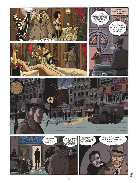 En temps de guerre, mieux vaut choisir son camp.Dans le Paris occupé du début des années 1940, les cabarets de Pigalle continuent d’accueillir les clients dans une ambiance de fête ! C’est là que Victor passe ses nuits, sur les tables de jeu. D’origine turco-juive, ce truand proche de la pègre collabore aussi avec l’occupant nazi. Ses affaires tournent bien. Se revendiquant « neutre », Victor aide cependant certains amis à quitter le pays. Mais qu’adviendra-t-il si les Allemands viennent à apprendre ses origines juives ? Tout en poursuivant ses activités lucratives il se rapproche de la Résistance et des gaullistes ! C’est le début d’un triple jeu dangereux. En continuant à fréquenter Aurore, une sublime chanteuse de music-hall qui divulgue des informations-clés dans ses chansons, il n’a qu’un but : acquérir plus de clubs. À ce rythme, Pigalle pourrait bientôt être à ses pieds. Mais derrière le bain de sang inhérent au contrôle de ces cabarets, Victor a un plan. Une fois devenu patron, les gérants lui communiqueront les sources de leurs clients allemands, qu’Aurore s’empressera de transmettre à Londres ! Mais alors que l’étau se resserre autour de la capitale et que la déportation commence, Victor prend de plus en plus de risques ... vient-il d’embrasser la cause au péril de sa propre vie ? Ce polar historique nous plonge dans les milieux troubles de la pègre à travers l’histoire fictive mais passionnante d’un personnage qui va trouver sa rédemption. Ce second tome clôt un diptyque au dessin réaliste et inspiré, avec un scénario bien ficelé, qui signe le retour d’un tandem talentueux (Les Miroirs du Crime, Alfred Hitchcock, Du Côté de l’Enfer…).