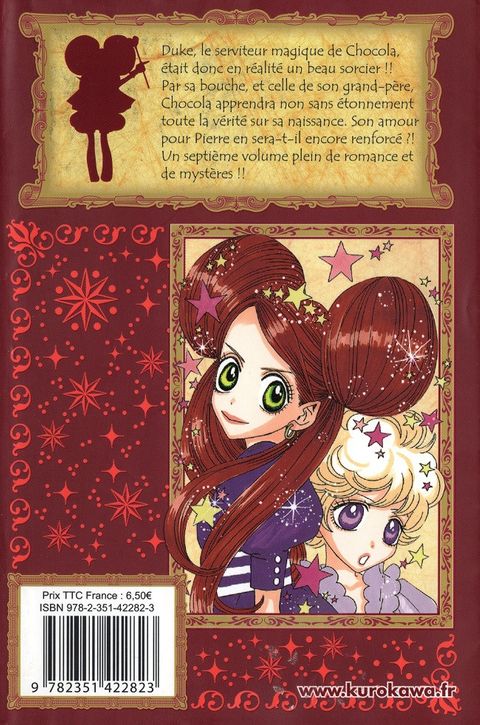 Duke, le serviteur magique de Chocola, était donc en réalité un beau sorcier ! Par sa bouche, et celle de son grand-père, Chocola apprendra non sans étonnement toute la vérité sur sa naissance. Son amour pour Pierre en sera-t-il encore renforcé ?! Un septième volume plein de romance et de mystères !