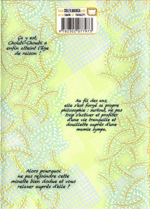 Ça y est, Choubi-Choubi est devenue un bon gros chat ronronnant. Elle a enfin atteint l'âge de raison et s'est forgée au fil des ans sa propre philosophie surtout, ne pas trop s'activer et profiter d'une vie tranquille et douillette auprès d'une mamie sympa. Mais tout ceci est sans compter sur Chi le chaton et autres bestioles qui vont l'éloigner de sa confortable demeure. Alors pourquoi ne pas rejoindre cette minette bien dodue et vous relaxer auprès d'elle ? Ça y est, Choubi-Choubi est devenue un bon gros chat ronronnant. Elle a enfin atteint l'âge de raison et s'est forgée au fil des ans sa propre philosophie surtout, ne pas trop s'activer et profiter d'une vie tranquille et douillette auprès d'une mamie sympa. Mais tout ceci est sans compter sur Chi le chaton et autres bestioles qui vont l'éloigner de sa confortable demeure. Alors pourquoi ne pas rejoindre cette minette bien dodue et vous relaxer auprès d'elle ?
