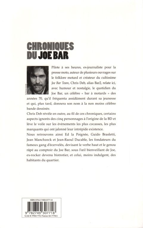Les seventies, un troquet populaire en banlieue parisienne, quatre enragés du guidon aussi vantards qu'intrépides, la mauvaise foi et le sarcasme élevés au rang d'art. et nous voici plongés dans le quotidien de Joseph Bartolomé, alias « Joe », ex-rocker devenu patron de bar, témoin privilégié des turpitudes et des palabres de ses clients motards.Dans une série de nouvelles au langage fleuri et aux répliques qui flinguent comme du Audiard, Chris Deb fait la chronique et le récit d'une époque à travers le regard des personnages de la BD culte Joe Bar Team. Une époque où les limitations de vitesse n'existaient pas et où les radars automatiques étaient encore un lointain rêve de technocrate. Une époque bénie !