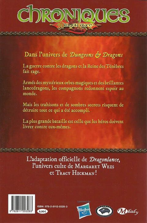 La guerre contre les dragons, serviteurs de Takhisis, Reine des Ténèbres fait rage. Armés des mystérieux orbes magiques et de la brillante lancedragon, les compagnons redonnent espoir au monde. Mais, à laube dun jour nouveau, la lumière est faite sur les sombres secrets que les amis dissimulaient en leur c½ur. Les trahisons, les traîtrises, les faiblesses sont sur le point de détruire tout ce qui a été accompli. La plus grande bataille est celle quils doivent livrer contre eux-mêmes. Et sils en sortent vainqueurs, alors, ils seront de véritables héros.