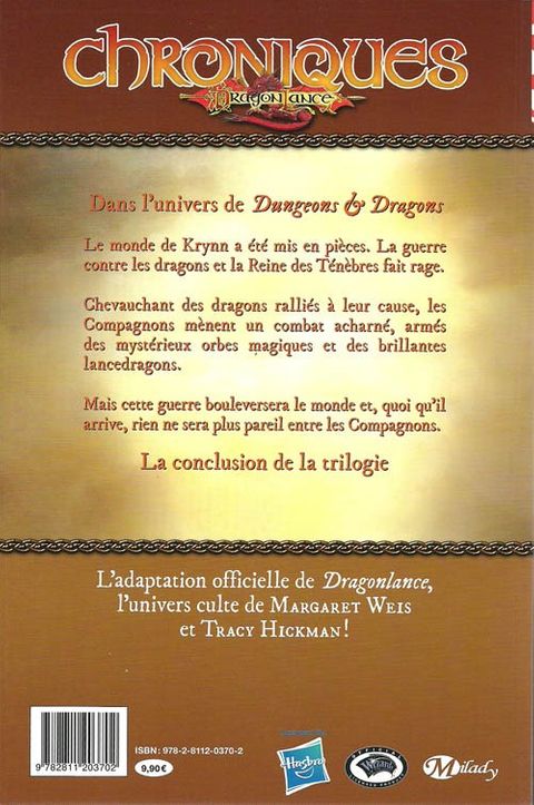 Le monde de Krynn a été mis en pièces. La guerre contre les dragons et la Reine des Ténèbres fait rage. Chevauchant des dragons ralliés à leur cause, les Compagnons mènent un combat acharné, armés des mystérieux orbes magiques et des brillantes lancedragons. Mais cette guerre bouleversera le monde et, quoi qu'il arrive, rien ne sera plus pareil entre les Compagnons. La conclusion de la trilogie.