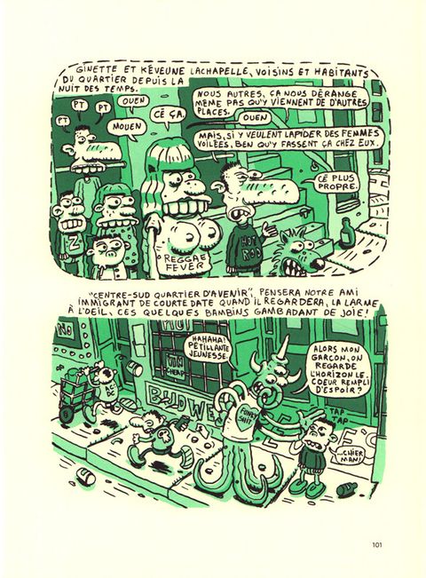 Installé depuis une vingtaine d'années dans le mythique quartier Centre-Sud de Montréal, Richard Suicide signe enfin la toute première étude anthropologique sérieuse – sous forme de bande dessinée – sur la faune (houblonnée) et la flore (gastrique) du vénérable quartier. Fiches pratiques et graphiques explicatifs à l'appui, l'auteur livre entre deux brosses un portrait touchant de ces éclopés qui se sont enfargés dans la rue Sherbrooke pour ensuite débouler la côte jusqu'à la rue Ontario. Ses semblables, ses frères. Cette nouvelle édition contient une histoire inédite.
